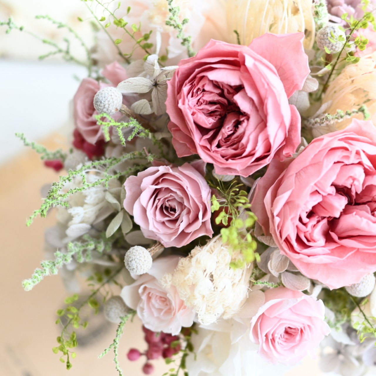 生花を乾燥させたものでとてもデリケートです。湿気や直射日光を避けていただいた方が長持ちいたしますが、少しずつ変わる色の変化も合わせてお楽しみいただければと思います。