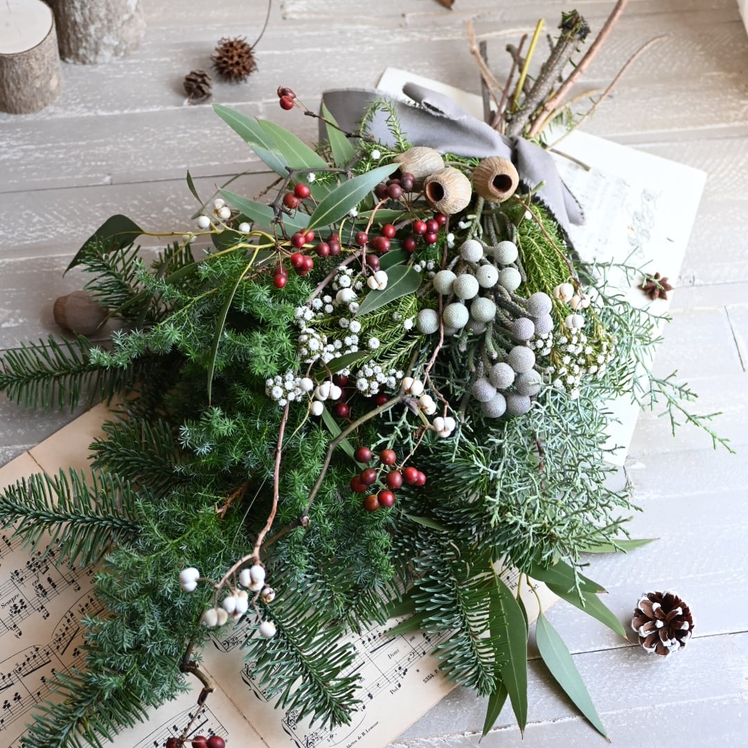 オレゴンモミを中心にフレッシュな花材をたっぷり使用した存在感たっぷりのスワッグです。