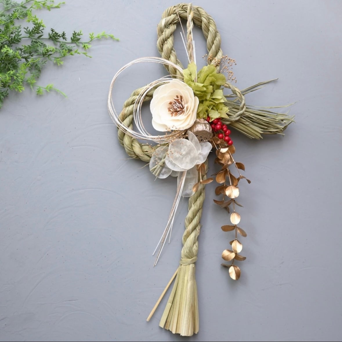 細身ですっきりしたしめ縄を変形リボン型リースにした、洋風お正月飾りです。