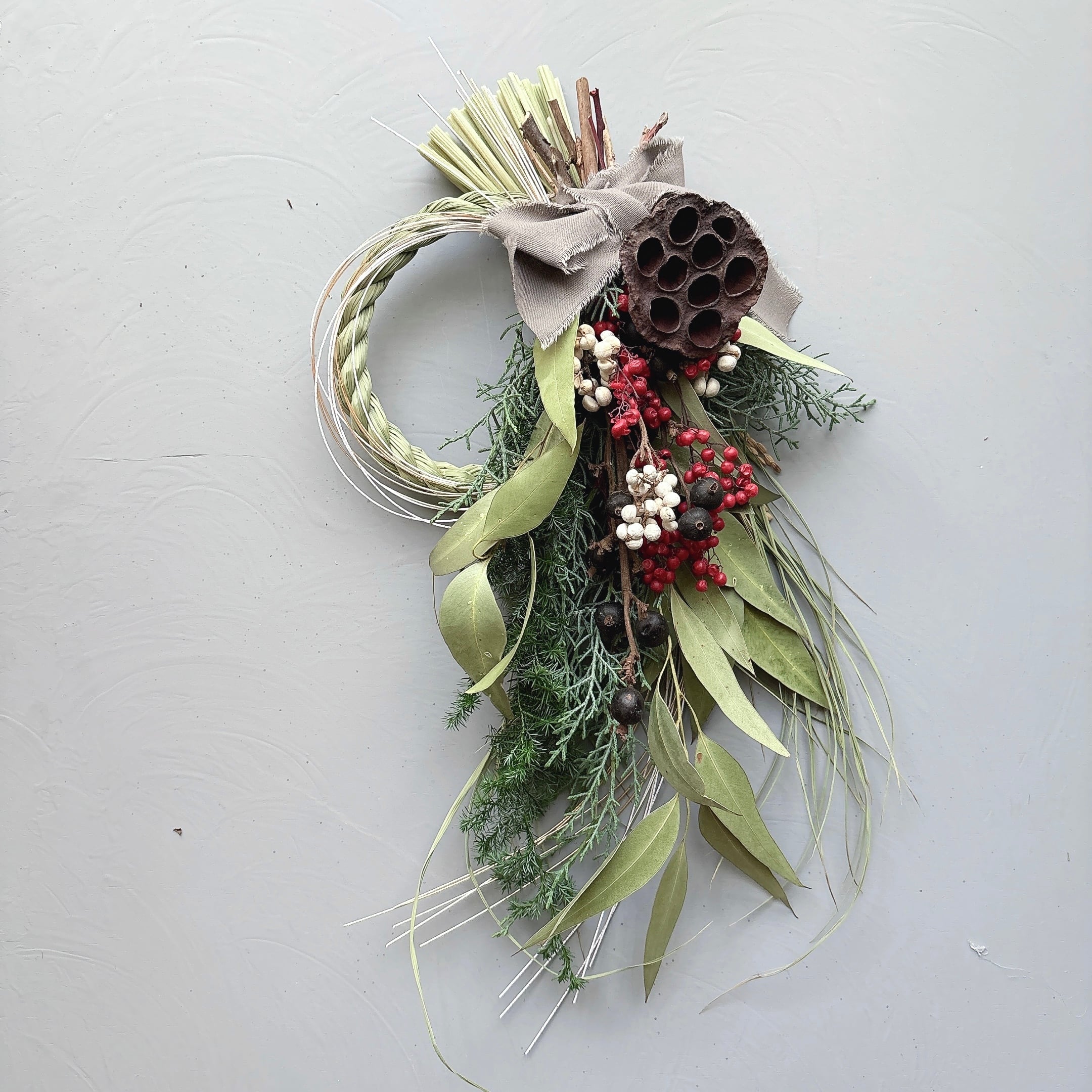 大きな蓮の実を中心に紅白の実ものやグリーンを流れるようにデザインしたおしゃれなしめ縄です。