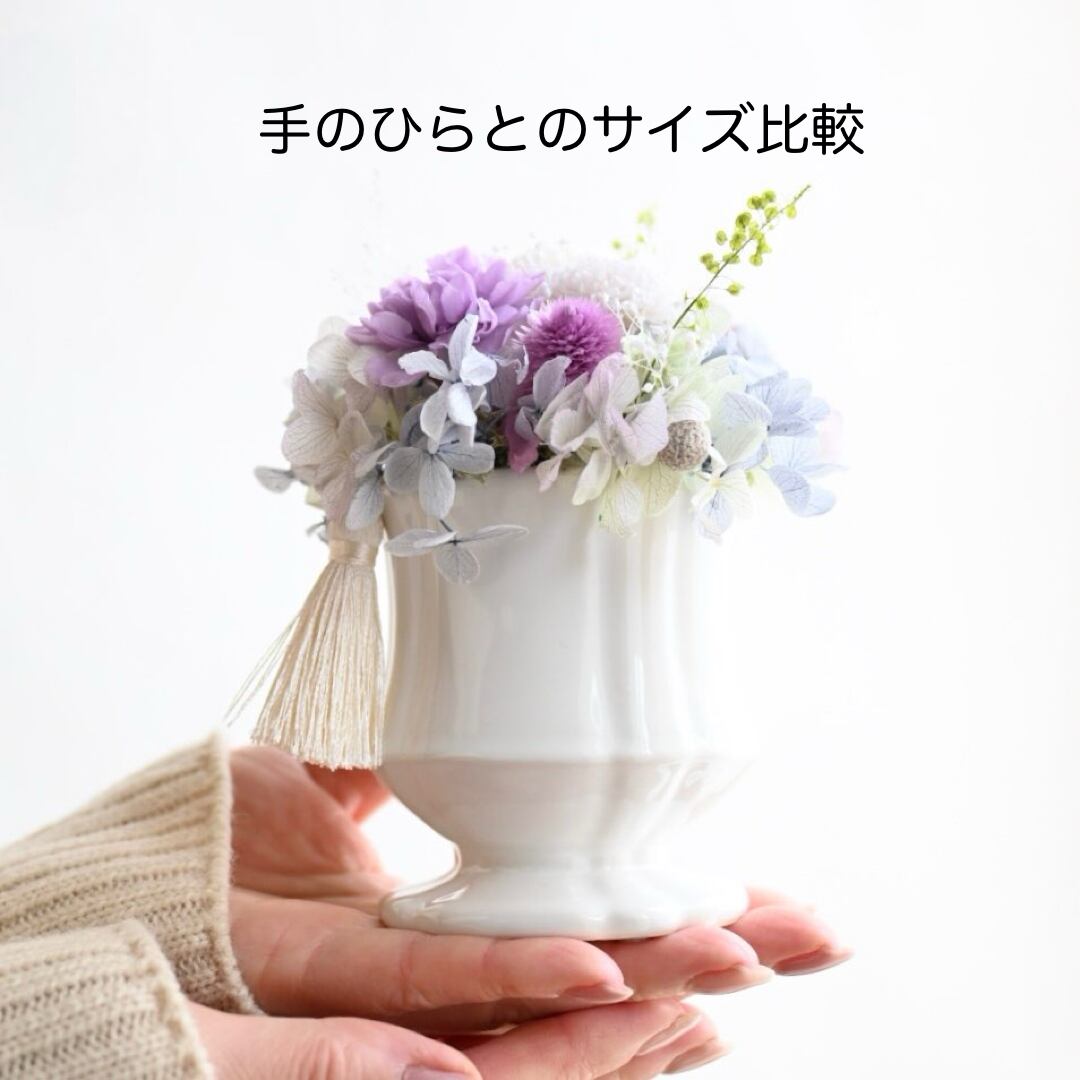 優しい色合いの花々を白い陶器にアレンジしておりどこに置いても調和しやすく、上品でやわらかな色彩が故人様への想いを伝えてくれますよ。