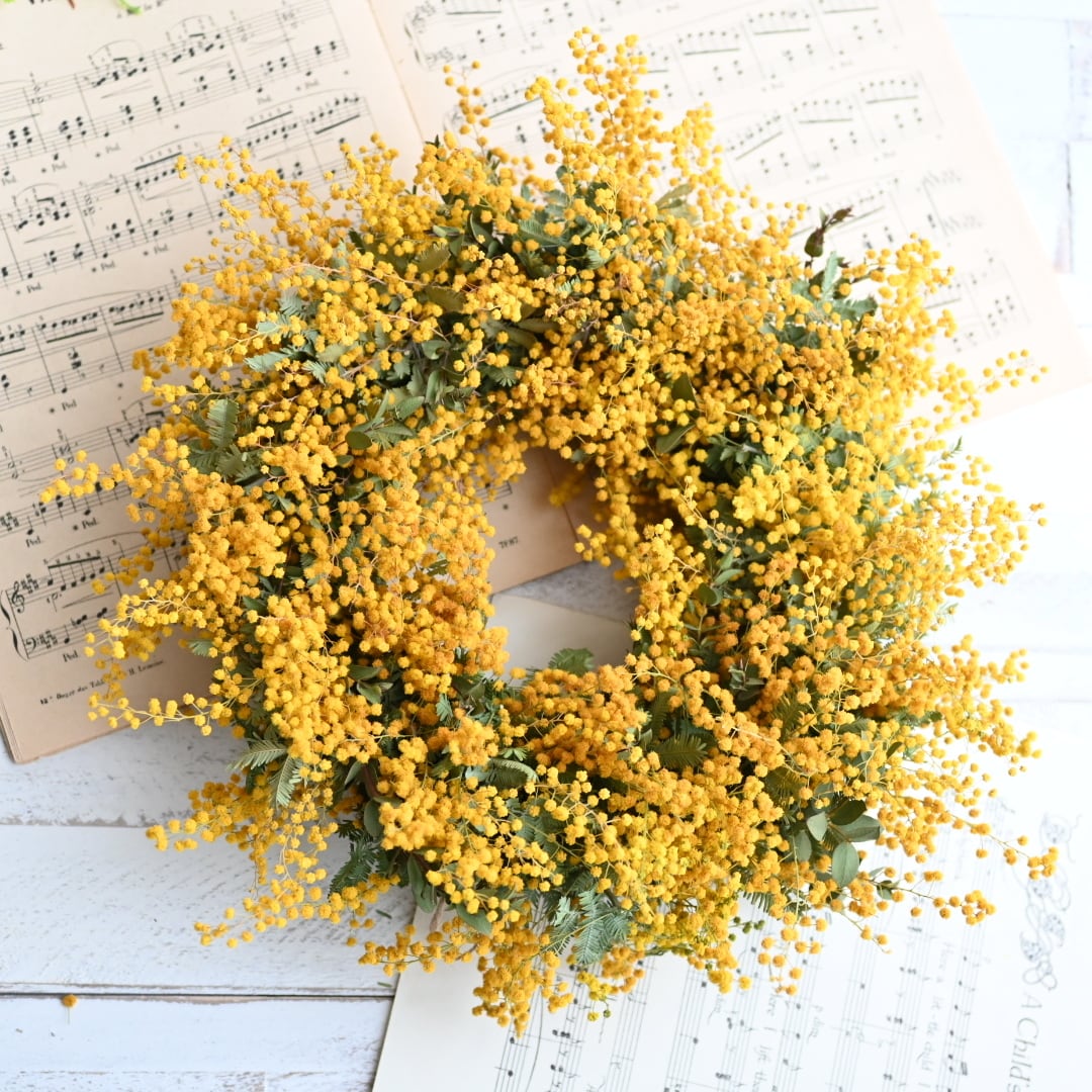 ⭐︎こちらはドライフラワーに仕上げたミモザのリースです。神奈川県より発送します。