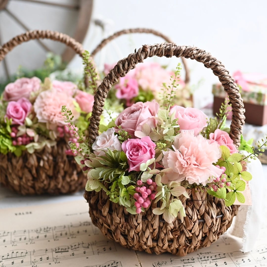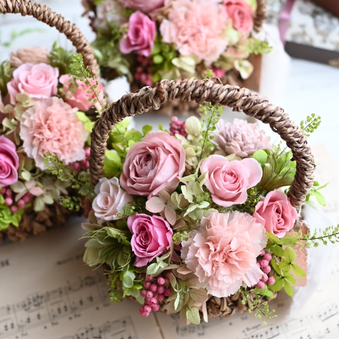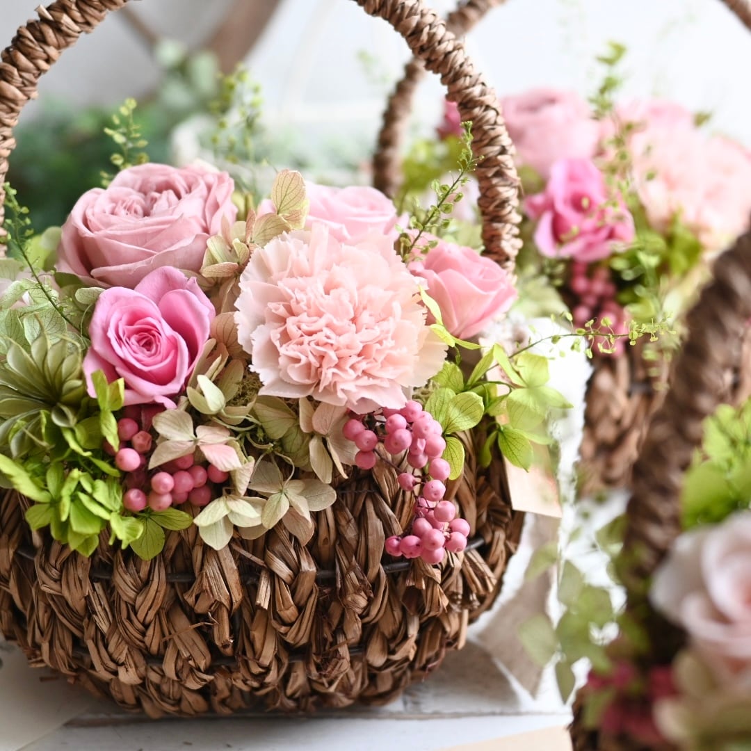 ニュアンスな色合いが魅力のモーヴピンクを中心に、ちょっぴり可愛らしさもある色合いでまとめた、ピンク系のバスケットアレンジメントです。