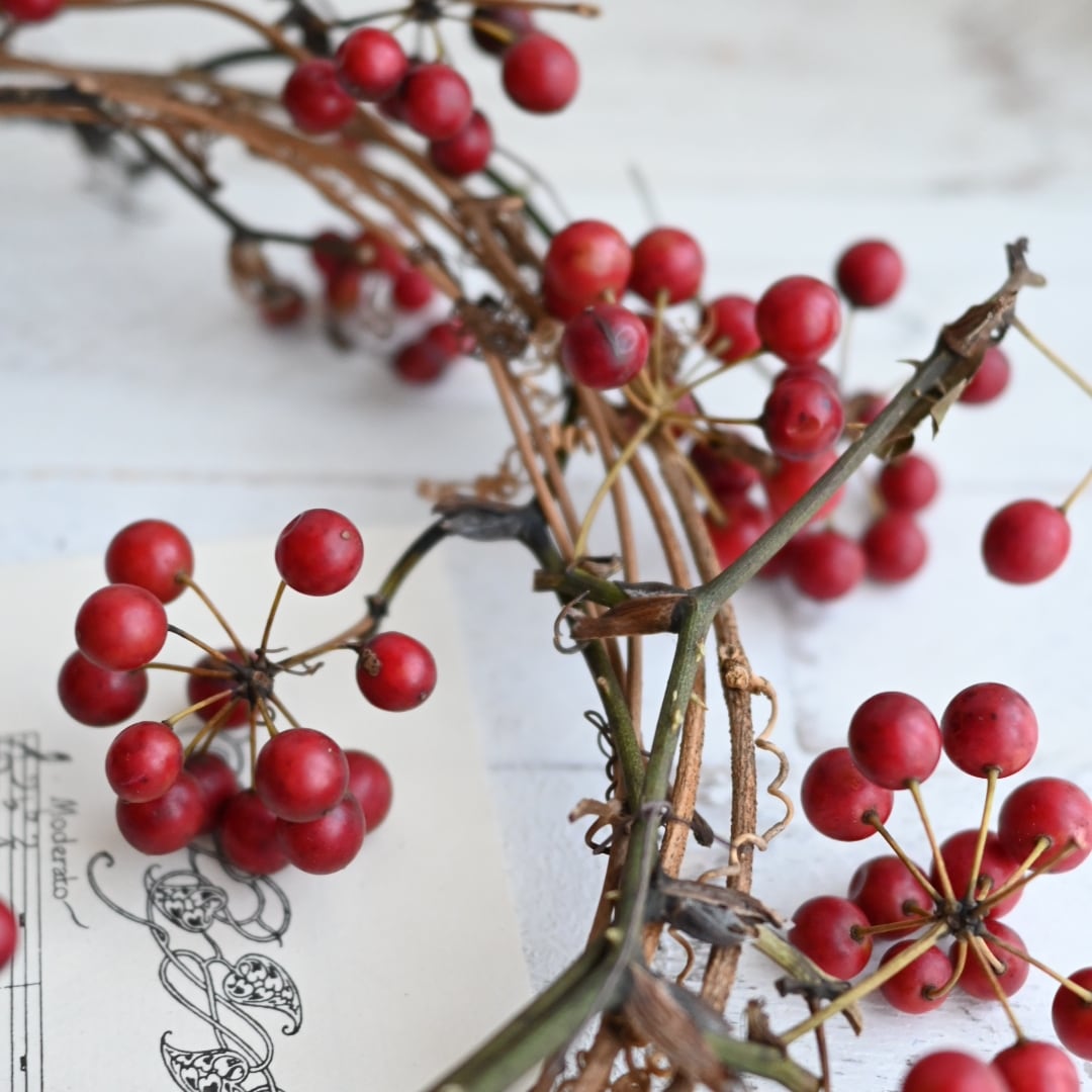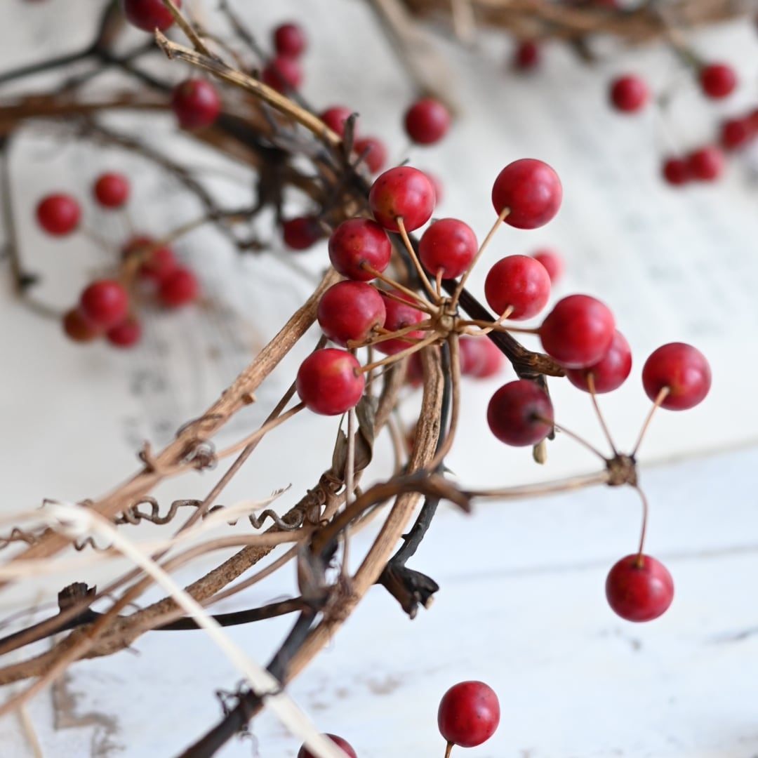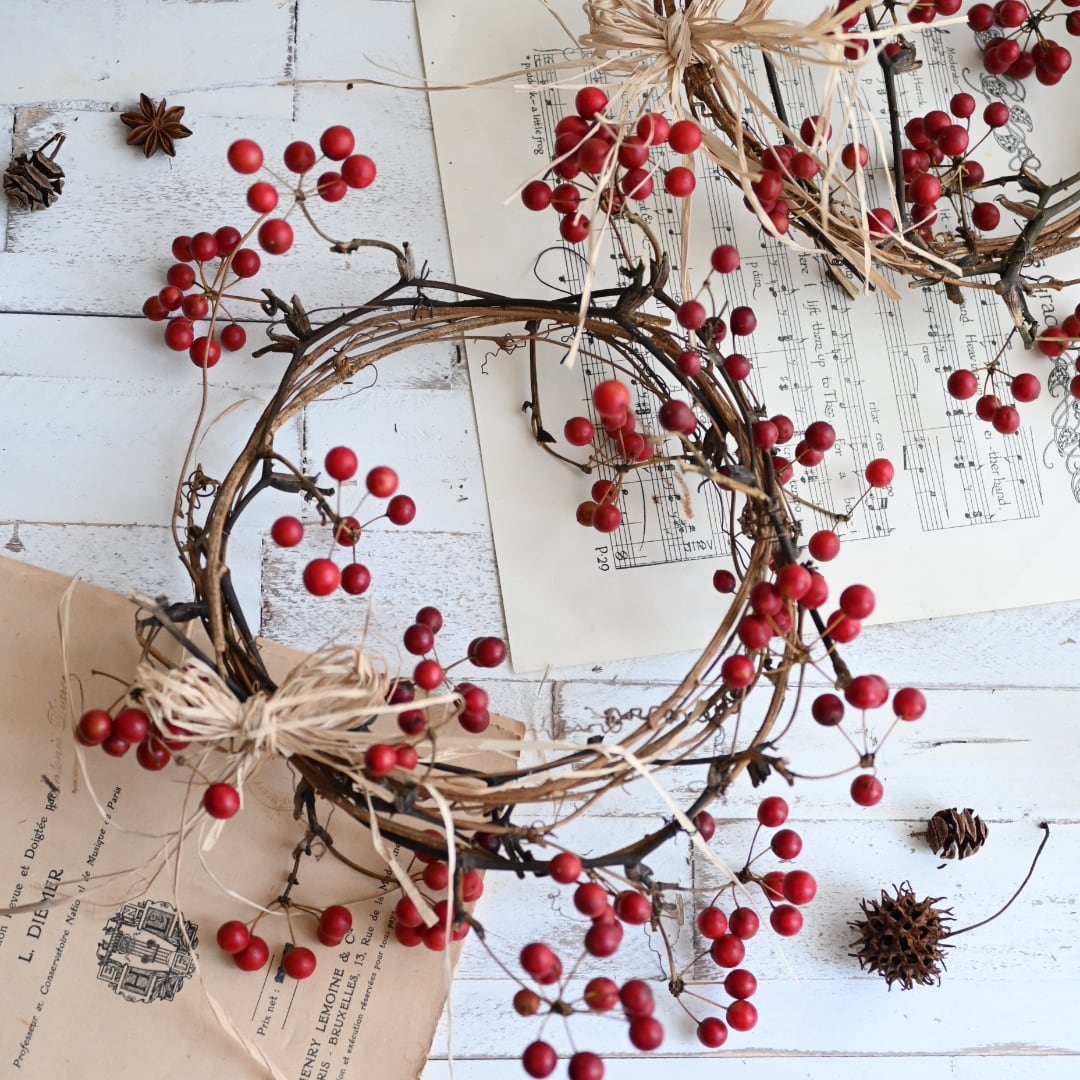 冬の定番、真っ赤でまんまるなサンキライを繋いだリースです。