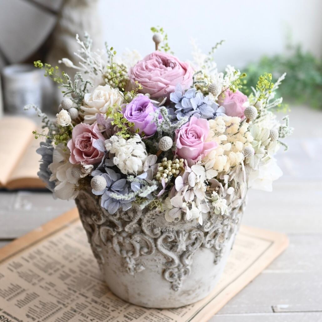 デザイン性のあるシャビーエレガントなテラコッタ鉢に、プリザーブドフラワーをアレンジした、高級感とナチュラル感を併せたオリジナルの作品です。
